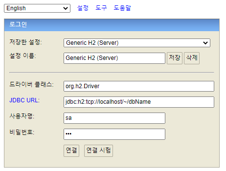 이때 Database path: 부분에 ./로 시작하면 h2 bin 폴더에 생성되고 ~/로 시작하면 유저폴더에 생성된다.