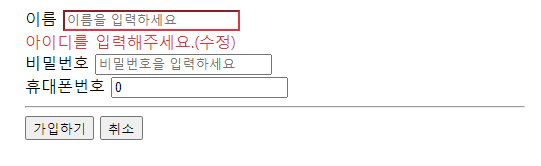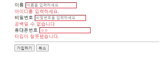 두 사진에서 볼 수 있듯이 '이름'에 지정한 에러메세지는 group으로 나눠서 지정한 메세지가 나타나고, group으로 지정하지 않은 부분은 메세지가 나타나지 않는 것을 알 수 있다.