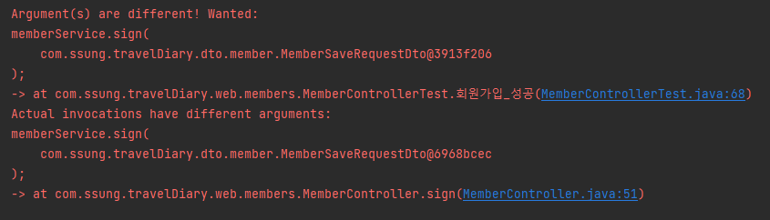 해당 에러의 내용인데 아무래도 파라미터를 넘겨서 컨트롤러에서 만드는 dto와 verify를 이용해서 테스트하는 dto의 주소값이 다르기 때문에 나타나는 에러인것 같았다.