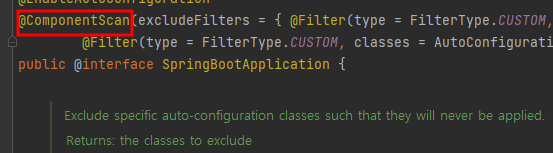 @SpringBootApplication은 스프링부트를 생성하면 가장 상위 패키지에 존재하는 클래스에 설정되어있다. 그리고 이 어노테이션 내부에 @ComponentScan이 들어있다.