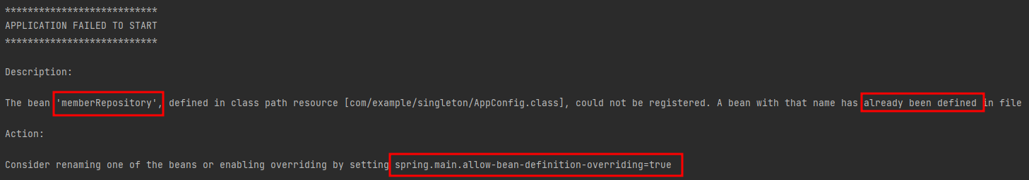 memberRepository가 이미 등록되어 있다는 에러메세지와 함께 어떤 식으로 설정을 바꾸면 사용할 수 있는지도 알려주고 있다.
