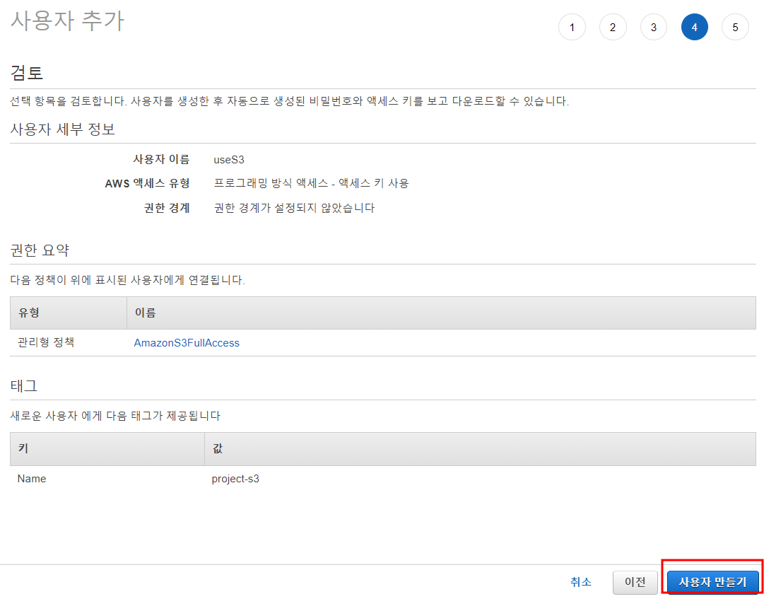 우리는 외부에서 S3로 접근하는 것이기 때문에 사용자를 추가하도록 하자.