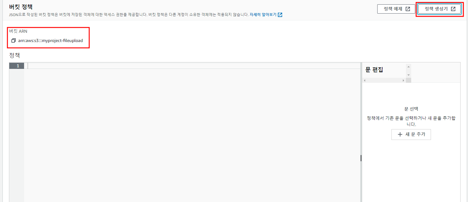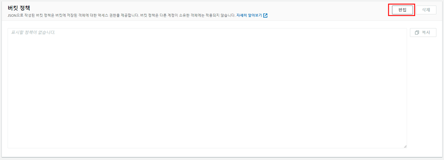 (6) 버킷생성이 완료된 후 생성한 버킷을 선택하고 '권한' 탭으로 들어오면 버킷 정책을 만들 수 있다.