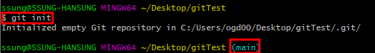 git init을 하게되면 위의 사진처럼 현재 경로 옆에 (main) 이라는 문구가 생긴것을 볼 수 있다. 이것은 현재 브랜치의 위치를 알려주는 것인데 git이 생성된 폴더로 들어가면 나타나게 된다. 브랜치에 대해서는 이후에 더 자세히 알아보도록 하자.