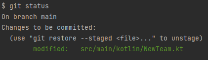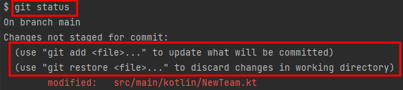 두 번째 박스를 보면 현재 상태에서 어떤 명령어를 사용하면 좋을지를 안내해주고 있다. 지금 안내받은 명령어는 'git add <file>'과 'git restore <file>'이 있다.