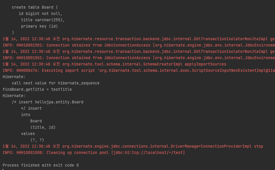 이렇게 설정을 마친 후 JpaMain클래스를 실행시키면 create table쿼리가 동작하는 것을 볼 수 있다.