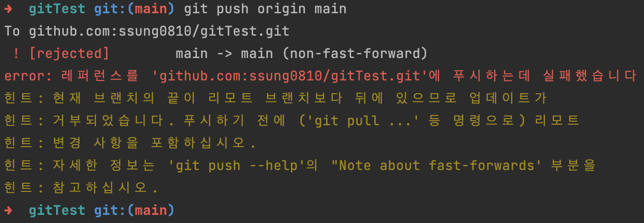 그렇다면 pull을 받고 진행하면 괜찮을까? 라고 했을 때 pull도 제대로 동작하지 않는다. 그냥 일반적으로는 안되고 --force를 사용해야 한다.