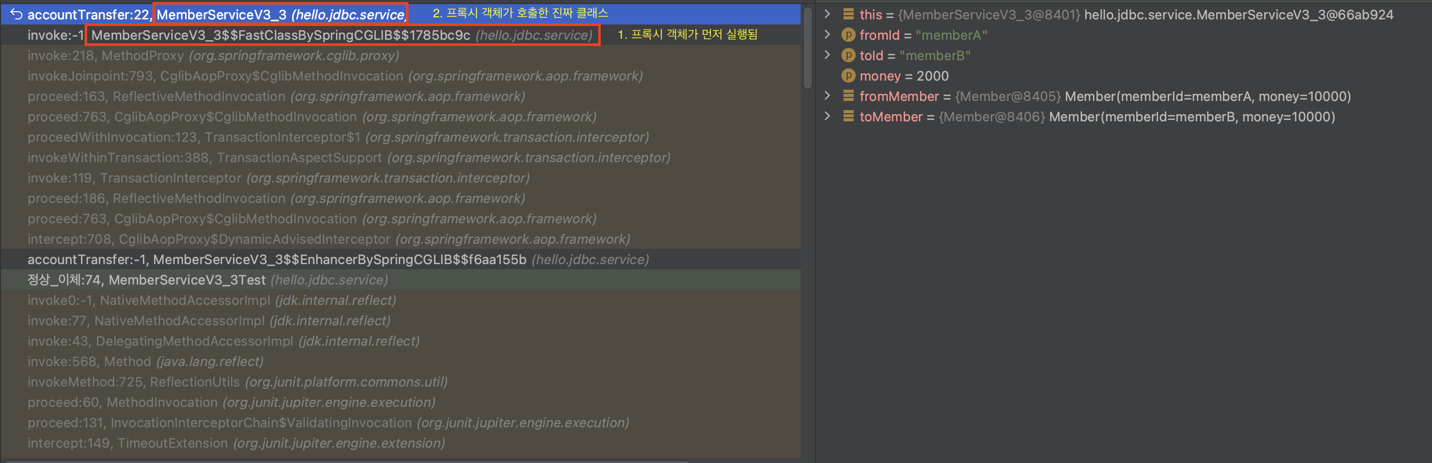 프록시 객체에서 스프링이 만든 트랜잭션이 실행되고 실제 객체를 호출해서 우리가 동작시키고자하는 비지니스 로직이 실행되는 것이다. 자세히 보면 프록시 객체의 이름이 MeberServiceV3$$FastClassBySpringCGLIB$$... 으로 나타나는 것을 볼 수 있는데 이 이름에서 중요한 부분은 CGLIB이다. 스프링은 버전마다 프록시를 만드는 방법들이 조금씩 바뀌었는데 지금은 최종적으로 CGLIB로 만들어지고 있다. 고로 CGLIB가 붙은 클래스는 스프링이 만든 프록시 객체라고 생각하면 된다.