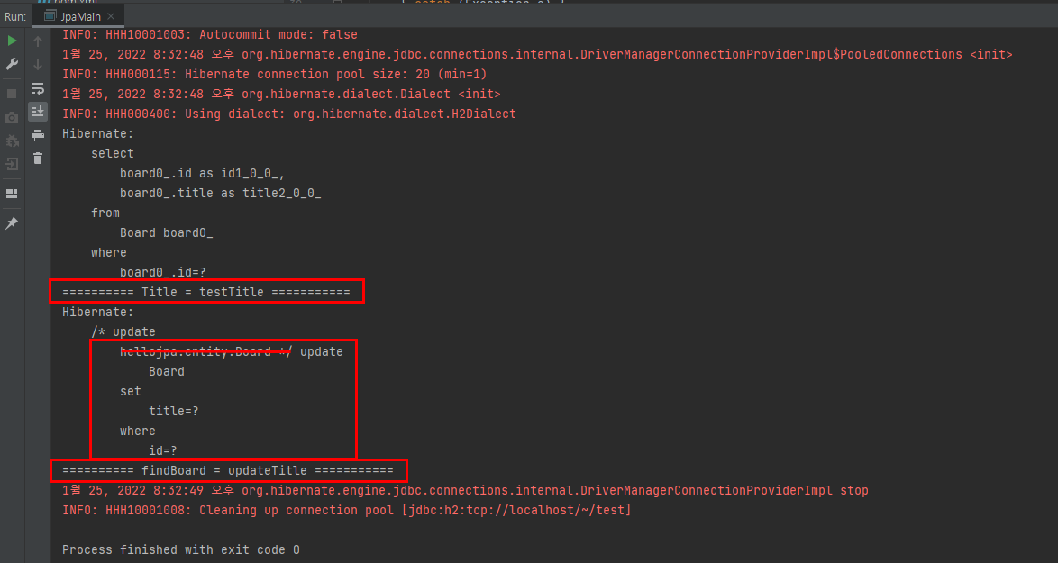 먼저 기존에 Board테이블에 입력해놓은 데이터를 조회해온다. 그리고 가져온 데이터의 title값을 변경한 후 flush()를 이용해 강제로 쿼리를 DB에 전송한 뒤 다시 데이터를 조회해하면 데이터가 바뀐것을 볼 수 있다.