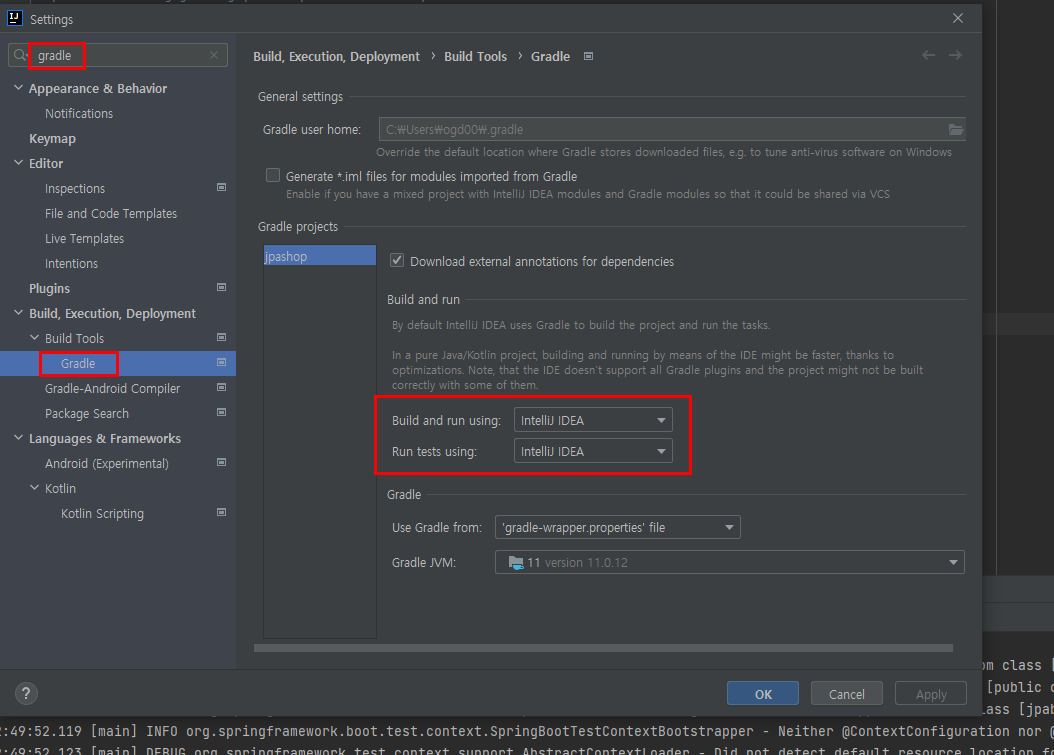 Build and run using과 Run tests using을 모두 IntelliJ IDEA로 변경해준다.